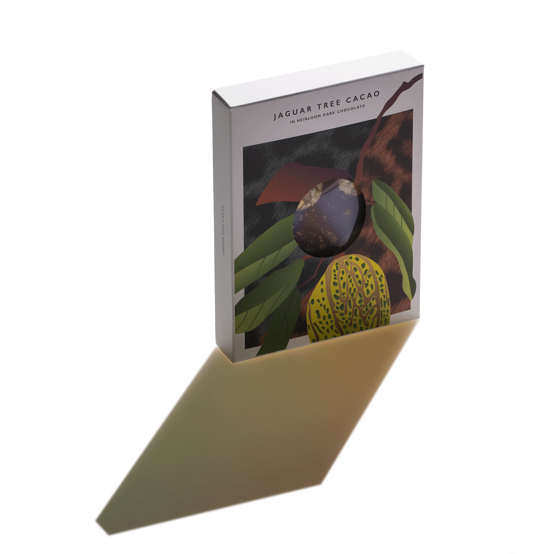 Theobroma bicolor (kakaowiec Macombo, Jaguar) jest jednym z najrzadszych gatunków z rodzaju Theobroma, (poza Theobroma cacao - zwykłe kakao). Legenda głosi, że w dzikiej tropikalnej dżungli do dziś przetrwało tylko około tysiąca drzew. Od czasów prehistorycznych kakao Jaguar było używane zarówno do celów spożywczych, jak i rytualnych. Udało nam się zbudować bardzo ograniczony łańcuch dostaw tych rarytasów, ale także nadaliśmy mu nieco dymnego i pikantnego akcentu dzięki tej autorskiej recepturze. Aby pójść jeszcze dalej, zanurzyliśmy ziarna w czekoladzie wykonanej z białych nasion kakaowca. Zdobądź trochę, dopóki nie zniknie na zawsze.